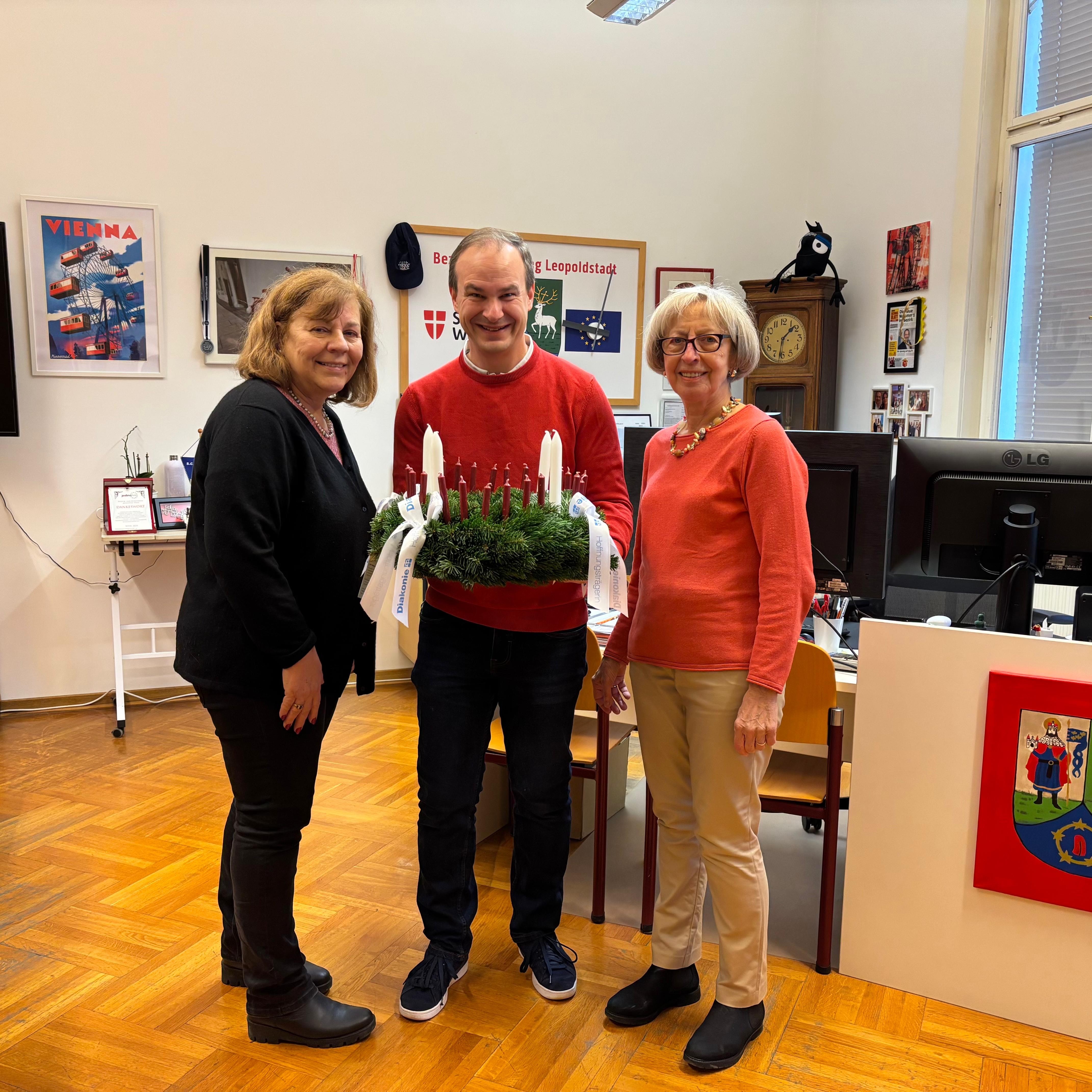 Unsere erste Station führte uns in den 2. Bezirk, die Leopoldstadt. Dort durften wir den Original Diakonie Kranz an den Bezirksvorsteher-Stellvertreter Mag. Christoph Zich übergeben. Wir haben uns bei Herrn Mag. Zich herzlich für den offenen Austausch bedankt, den wir zwischen unserer Pfarrgemeinde und der Bezirksvertretung pflegen dürfen. Wir freuen uns, dass der Kranz nun im Bezirksamt für festliche Stimmung sorgen wird.