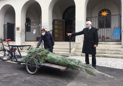 Wer hilft mit beim Christbaum Schmücken? Am 4. Advent-Sonntag, nach dem Gottesdienst, geht es los. Da wird der Baum "aufgeputzt". Auch dieses Jahr wurde unser Christbaum per Fahrrad geliefert und hat somit seinen letzten Weg klimafreundlich zurück gelegt. Wir danken den Nachbarn von der kathol. Pfarre Allerheiligen, die uns wieder einen schönen Baum ausgesucht haben.