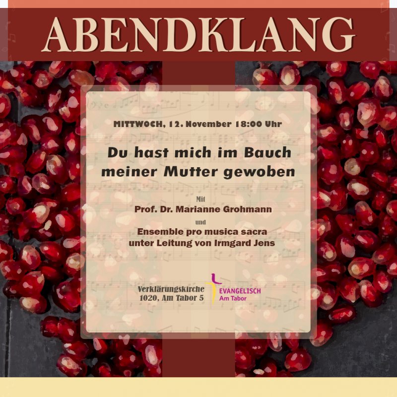 Im Zentrum des aktuellen Abendklang stand das Thema "Du hast mich im Bauch meiner Mutter gewoben" (Psalm 139,13), welches sich mit Unfruchtbarkeit, Geburt und dem Lebensanfang in der Hebräischen Bibel beschäftigte.Die wissenschaftliche Einordnung übernahm Prof. Dr. Marianne Grohmann und die musikalische Gestaltung wurde vom Ensemble pro musica sacra unter der Leitung von Irmgard Jens beigetragen.