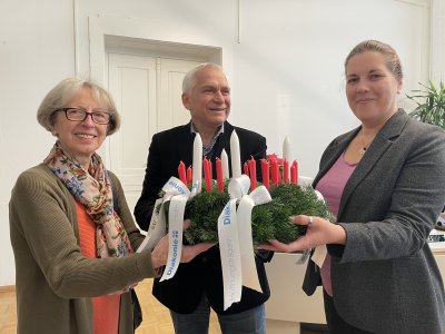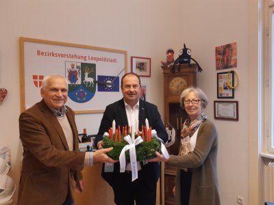 Ende November überreichten Pfarrer Hannes Pitters und Kuratorin Erna Huber einen solchen Original Adventkranz an Bezirksvorsteherin Christine Dubravac (Brigittenau) und Alexander Nikolai (Leopoldstadt.